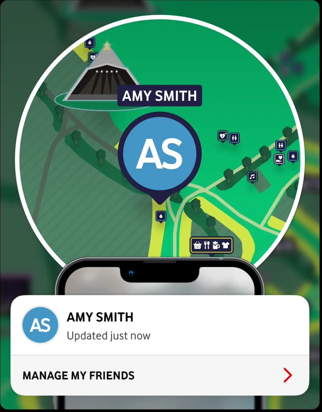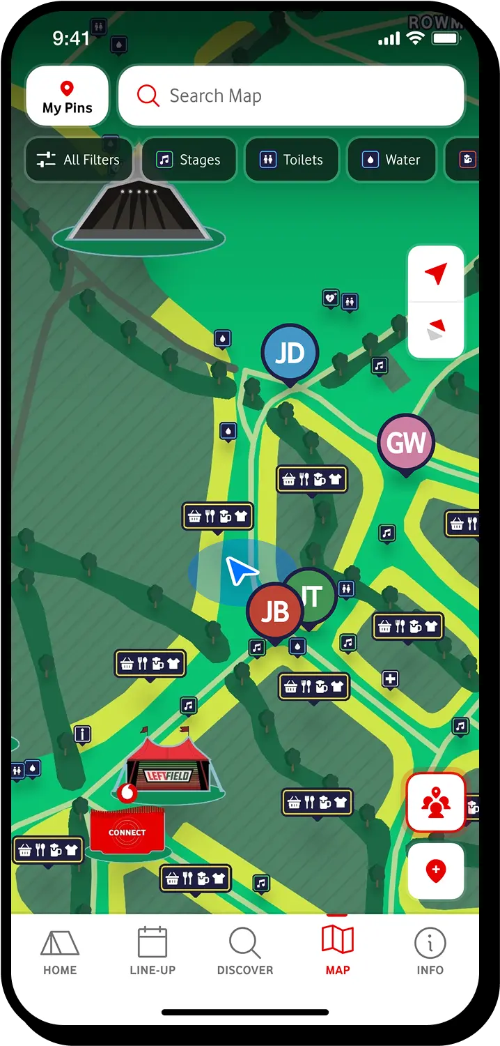 Explore the Festival grounds with ease. Drop a pin on your tent, find the nearest loos, stages, bars, merch stands and more.