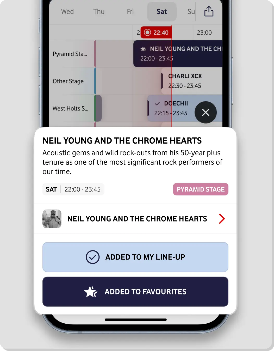 Discover artists to add to your line-up and select your favourites. No signal? No stress. The app works without reception, so you're never stuck.